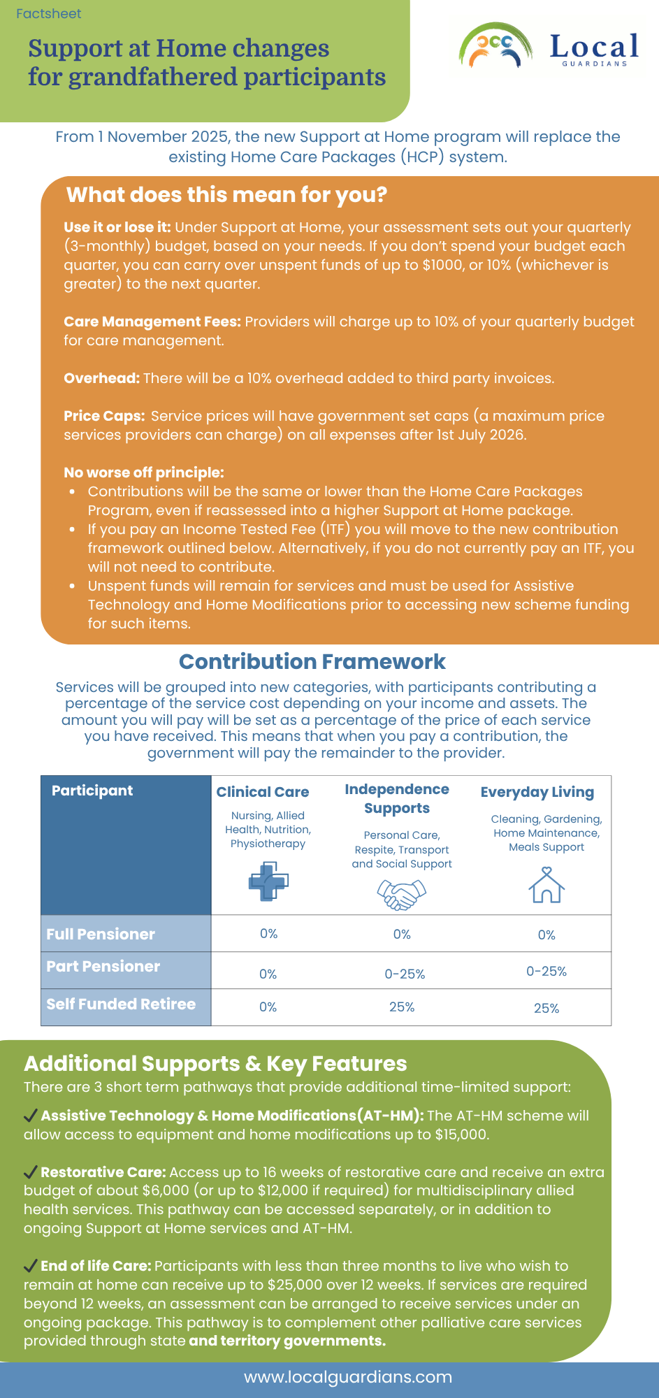 If you have a Home Care Package that was approved before 12th September 2024 you are considered a ‘Grandfathered Participant’ under the new Support at Home Program.